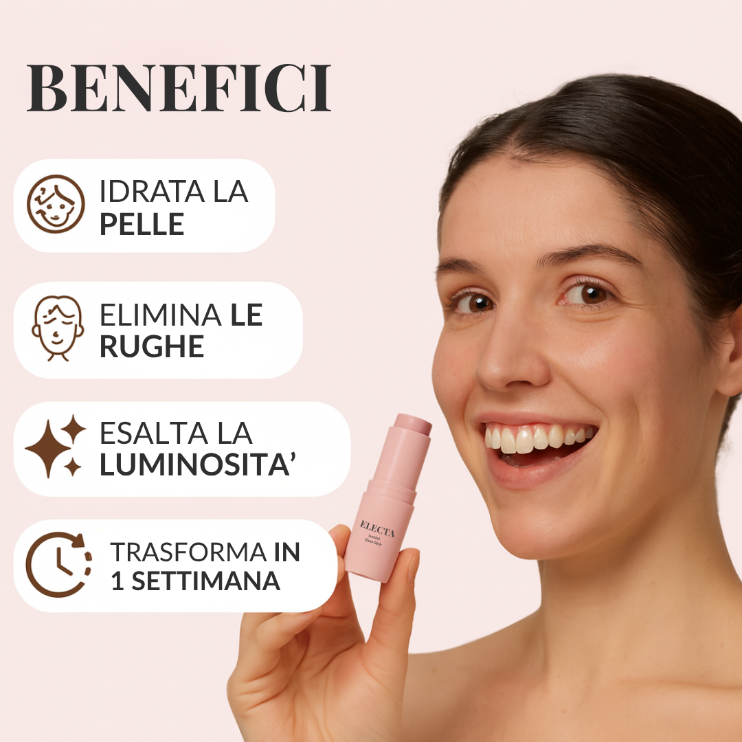 La formula concentrata del Luminè Glow Stick combina collagene marino e acido ialuronico per agire in profondità, migliorando l’elasticità e riducendo le rughe sottili.